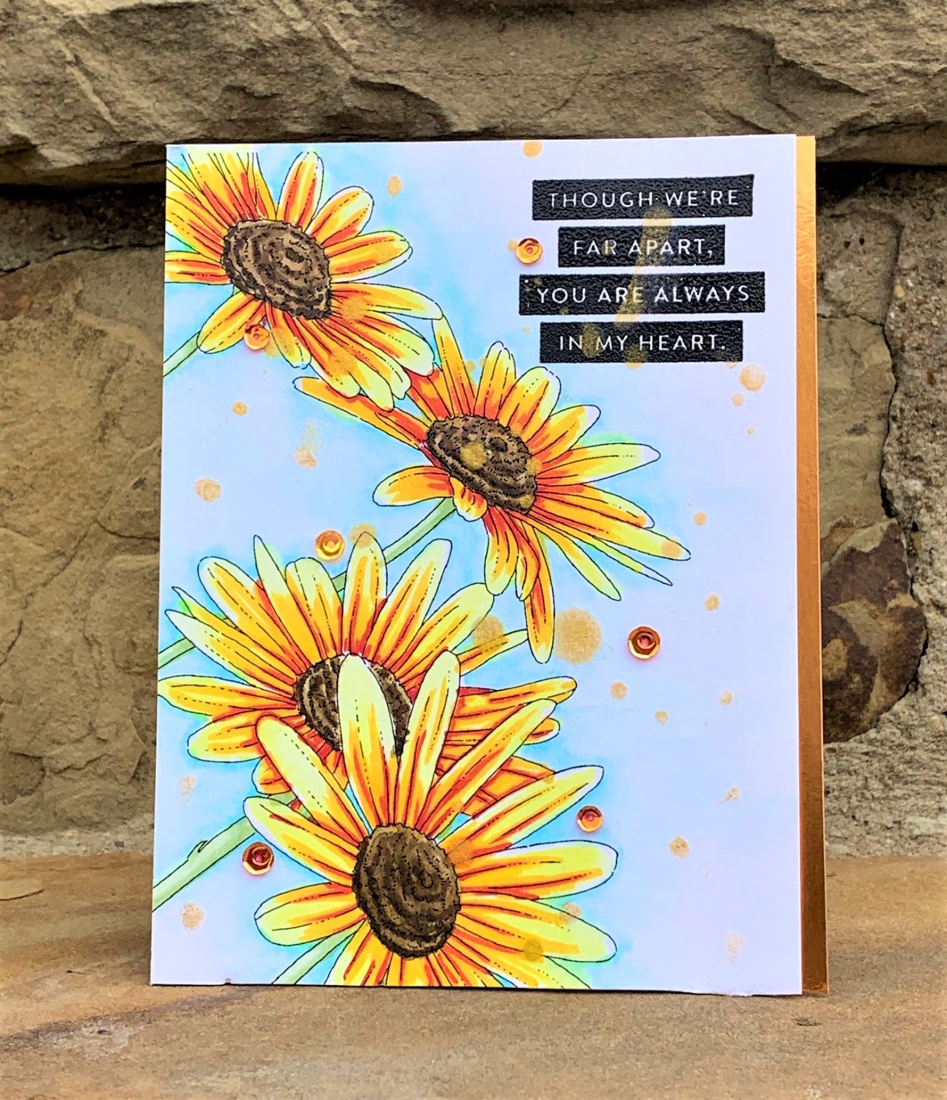 This Simon Says Stamp set Thankful Flowers has this really beautiful large flower cluster as well as single flowers and great sentiment stamps. I Copic colored the flowers in shades of teal and mounted it on Audrey blue cardstock from Simon Says Stamp.